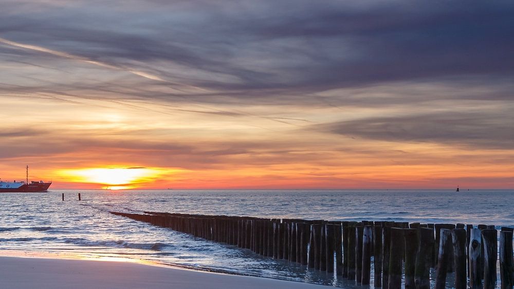 De ondergaande zon aan de kust van Zeeland, de houten palen die op het strand en in zee staan dienen als golfbrekers. De lucht kleurde prachtig blauw en oranje en het vrachtschip verlaat Zeeland op weg naar........