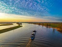 Panoramische luchtfoto van de IJssel en het Reevediep tijdens een ondergaande lentezon in Overijssel. De stroming van de rivier leidt naar de ondergaande zon in de verte terwijl de lichten in de stad oplichten aan het einde van een mooie lentedag. Een vrachtschip vaart op de rivier richting de ondergaande zon.