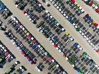 Diverse verschillend gekleurde vrachtwagens in een rij op een parkeerplaats van bovenaf gezien. De vrachtwagens staan in keurige rijen naast elkaar geparkeerd.