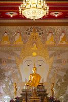 Te midden van de sublieme sfeer van Wat Suthiwararam in Bangkok staat de gouden Boeddha, een majestueuze belichaming van vrede en innerlijke harmonie. Zijn gezicht, dat wordt gekenmerkt door fijne details, gloeit in warm goud, dat met zachte elegantie samensmelt met de weerkaatsende lichtstralen in de kamer. Zijn gesloten ogen lijken de…