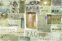 'Vrede in alle talen', collage. Het woord VREDE in 28 talen samengevoegd tot een collage.