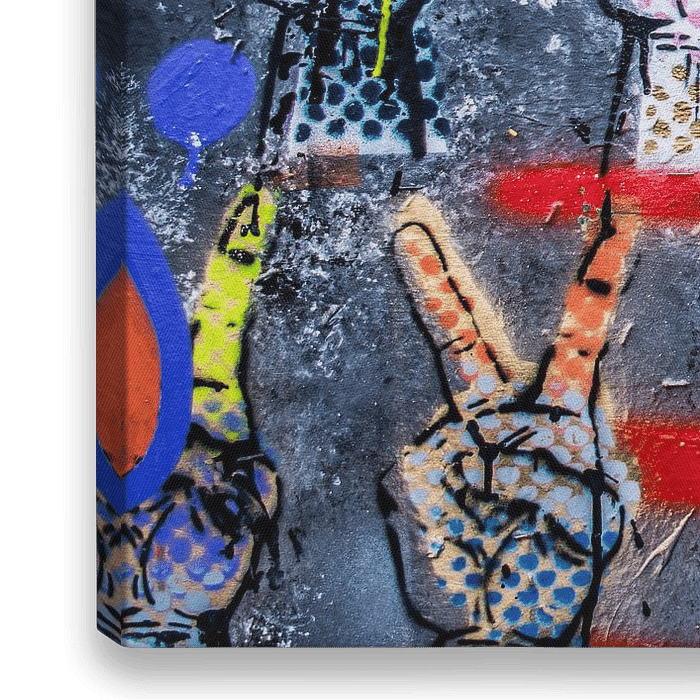 Een klein beetje meer vrede in de wereld zou fijn zijn! Berlijnse graffiti en tijdelijke straatkunst, maar voor nu vastgelegd met een foto. Door middel van stencil kunst staat het vredesteken, twee vingers in een V teken, vele malen kleurrijk afgebeeld op een muur.