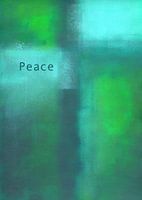Het abstracte schilderij is geschilderd in verschillende heldere tinten groen, blauwgroen en blauw en drukt vrede, hoop, geloof, vreugde en liefde uit. Vage geometrische vormen vormen een kruisvorm in dit kunstwerk. Het schilderij wordt aangevuld met de woorden Peace.