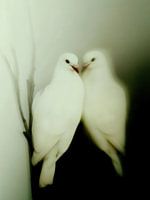 Stylistisch fotografisch werk van twee witte tortel duiven in een mistige wereld. het symbolische werk straalt liefde uit.