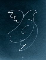 Tekening van een duif, in enkele seconden in een vlotte beweging afgebeeld. Gebruik van inkt op papier. Daarna gekleurd en opgelicht tegen een sfeervolle, gedempte, achtergrond.
