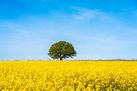 Bloeiend koolzaad op de Friedenseiche in de lente bij Hombressen, Hofgeismar in het district Kassel, Hessen, Duitsland.