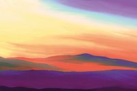 Schilderij van een vredig landschap met bergen bij zonsopkomst in mysterieuze, bijna surreal kleuren paars, geel en oranje.