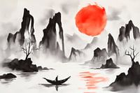 Een majestueuze zonsondergang baadt de zachte, schaduwrijke bergen in een dieprode kleur, terwijl een eenzame roeier kalm over het gladde water glijdt. De rustgevende kleurencombinatie van zwart, wit en rood creëert een harmonieuze sfeer die perfect is voor een woonkamer en uitnodigt om te ontspannen en te dromen.
