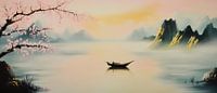 Zachte pastelkleuren vermengen zich met het kalme wateroppervlak, terwijl een eenzaam bootje sierlijk door het landschap glijdt. Delicate bloesems groeien boven de glooiende heuvels - een perfect samenspel van natuur en rust. Deze harmonieuze voorstelling is ideaal voor een slaapkamer, waar het rust en sereniteit bevordert.