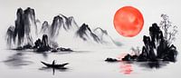 De majestueuze zonsondergang baadt de lieflijke landschappen in een warm, gloeiend rood, terwijl donkere silhouetten van de bergen en een stille boot harmonie uitstralen. Deze vredige compositie nodigt uit tot ontspanning en is perfect voor de woonkamer, waar het een rustgevende sfeer creëert.