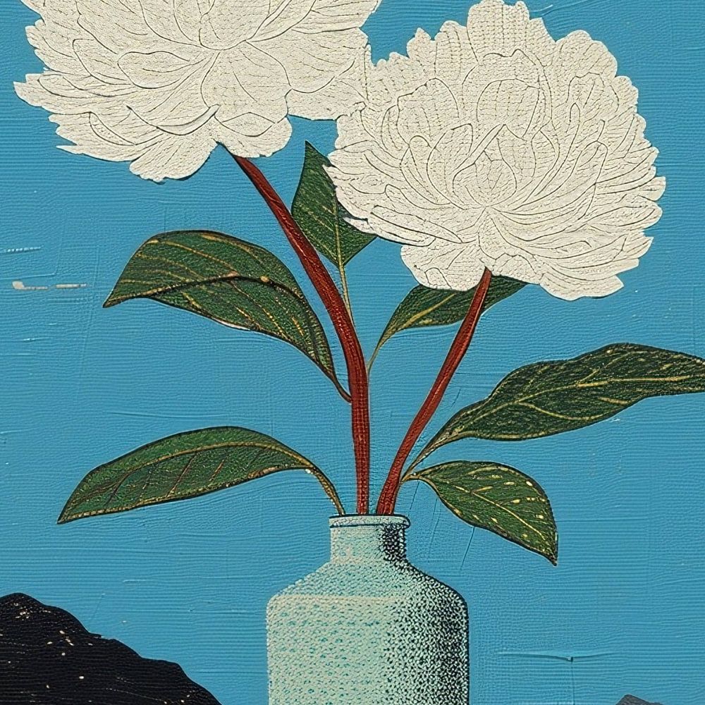 Twee witte bloemen in een blauwe vaas staan op een stapel boeken tegen een helderblauwe lucht. Het schilderij straalt eenvoud en kalmte uit, met subtiele details in de lucht en bergen.