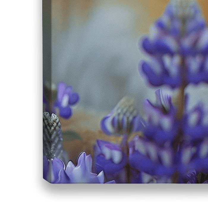 Dit kunstwerk toont een hyperrealistische close-up van een haas die vredig slaapt tussen een zee van paarse bloemen.