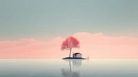 Een enkele boom, waarvan de roze bladeren lijken te fluisteren met de zachte bries, torent uit boven een bescheiden wit huisje. De rustige zee strekt zich uit tot aan de horizon, waar de pastelkleurige hemel de wereld ontmoet in een zachte omhelzing van warme en koele tinten.