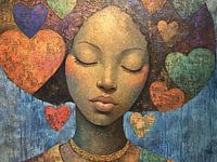 Vredige Liefde - Dit vrouwen schilderij toont een serene, gesloten ogen vrouw omringd door kleurrijke, zwevende harten in een rijk textureel prisma van aardetinten en pastelkleuren, stralend een gevoel van rust en liefde uit.