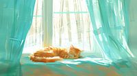 Het betoverende, vredige kunstwerk laat een oranje kat zien die geniet van een dutje in een zonovergoten kamer, waar het licht door turquoise gordijnen valt en een koel, dromerig sfeer creëert.