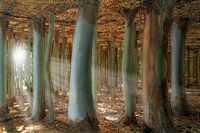 Fantasiebos, oorspronkelijk gefotografeerd in HDR, daarna digitaal bewerkt. Eucalyptus boomstammen en bosgrond. Zonnestralen komen van links het tafereel binnen.