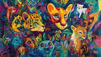 Het vreemde dieren kleurrijk abstract panorama schilderij is een levendig en fantasierijk kunstwerk dat een speelse kijk biedt op de dierenwereld. In deze brede compositie komen bijzondere, bijna buitenaardse dieren tot leven in een explosie van kleur, vorm en beweging. Elk dier lijkt afkomstig uit een droom of een andere dimensie, met ongewone kenmerken, expressieve ogen en verrassende details die de verbeelding prikkelen.
