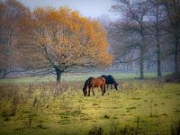 Toen ik dit tafereel zag was het net of ik in een schilderij stond. De 2 paarden een mooie herfstboom een beetje mist op de achtergrond en een vreemde snuiter die ik eerlijk gezegd daar niet verwacht had.