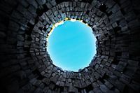 Vreemde poort en trompet in de lucht. Donkere tunnel en blauwe lucht, symbool van de dood
