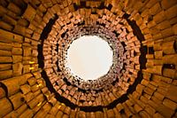 Vreemde poort en trompet in de lucht. Oranje tunnel