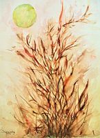 Ondanks alles blijft de natuur overeind en geeft ons moed en hoop om door te gaan. De zon kijkt toe geeft licht. en een gouden gloed aan het gras. Het is als een vreugde vuur maar dan zonder echt vuur. Het is een figuratief landschap geschilderd met aquarel.