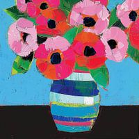 Levendig en kleurrijk boeket bloemen in een gestreepte vaas. De bloemen zijn gedomineerd door felle tinten roze, rood en oranje, met contrasterende zwarte harten en groene bladeren. De achtergrond is een helderblauw vlak, wat de felle kleuren van de bloemen nog meer laat opvallen. De vaas is horizontaal gestreept in verschillende tinten blauw, groen en wit, wat een speels en dynamisch effect geeft. De dikke, zichtbare penseelstreken en het gebruik van grove textuur geven het werk een expressieve, bijna abstracte uitstraling. Het geheel straalt energie en vreugde uit, en de eenvoudige maar krachtige compositie trekt direct de aandacht.