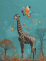 "Vreugdevolle Vlucht" is een speels beeld van een giraffe omringd door zwevende ballonnen, die een sfeer van feest en lichtheid uitstraalt. De warme herfsttinten en de lichtvoetige ballonnen bieden een contrast met de lange en statige gestalte van de giraffe. Dit kunstwerk zou een speelse, vrolijke sfeer brengen in elke leefruimte, ideaal voor diegenen die willen ontsnappen aan de dagelijkse sleur en hun verbeelding de vrije loop willen laten.