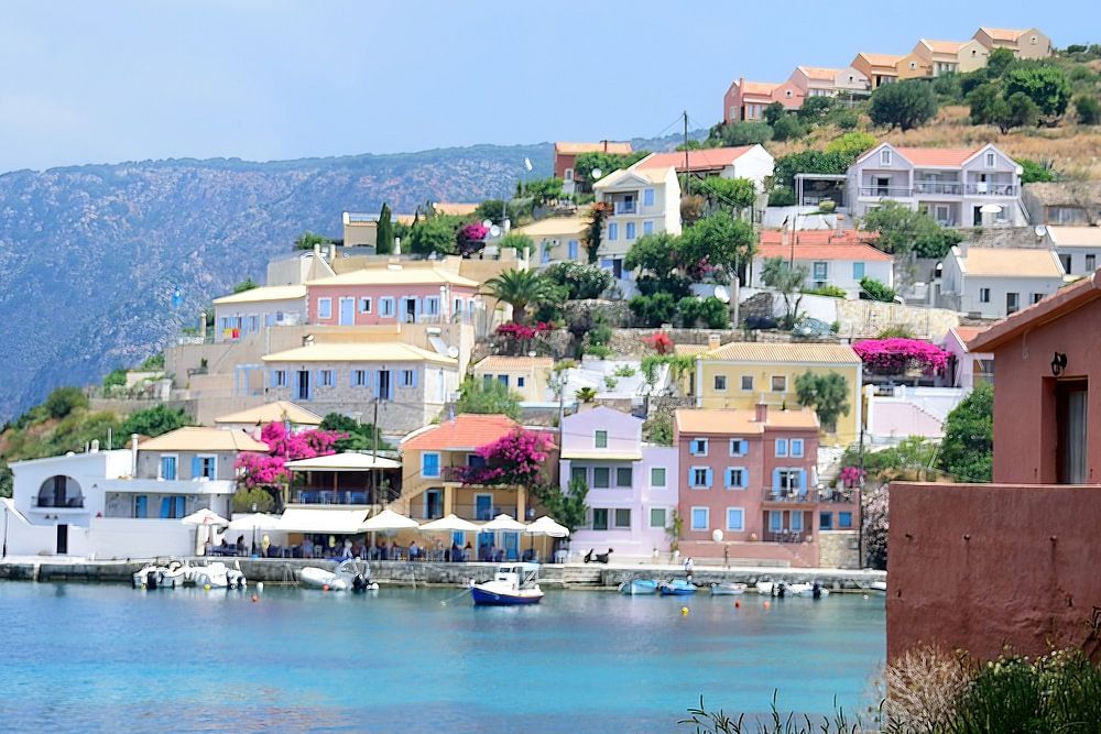 Na ongeveer een uur rijden van Argostoli kwam ik aan in het vriendelijke dorpje Assos op Kefalonia, Griekenland. Mooie gekleurde huizen rondom een kleine baai die baadt in de zon.