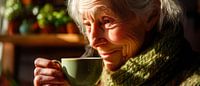 In het warme ochtendlicht straalt een oudere dame vreugde en tevredenheid uit. Met een kop dampende thee in haar hand en een knusse sjaal om haar nek straalt ze een gevoel van geborgenheid uit. Deze foto nodigt uit tot ontspannende momenten en past perfect in elke uitnodigende keuken of nostalgierijke leeshoek waar verhalen tot leven komen.