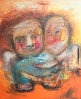 Dit schilderij is gemaakt door Nicole Habets, een hedendaagse kunstenaar die zich heeft laten inspireren door de abstracte kunststroming. Het schilderij toont twee figuren die elkaar omhelzen tegen een stralende oranje achtergrond. De figuren zijn geschilderd met brede, expressieve penseelstreken en levendige kleuren zoals oranje, blauw, wit en rood. De gezichten van de figuren zijn niet duidelijk gedefinieerd maar hebben herkenbare kenmerken zoals ogen en mond geschilderd met gedurfde streken.