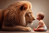De leeuw, een imposant roofdier, de baby, onschuldig en kwetsbaar. Ze kijken elkaar aan en zijn de beste vrienden, respect voor elkaar en vriendschap voor het leven. Het beeld is met behulp van ai gegenereerd.