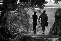 Vriendschap. Echtpaar wandelt hand in hand richting de zee bij Mount Maunganui. Tauranga Nieuw Zeealand. Zwart wit.