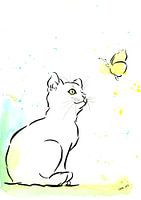 Vrienden zijn er in alle soorten en maten. Vriendschap is een inkttekening ingekleurd met waterverf. Een schattig katje zit op de grond en kijkt nieuwsgierig op naar een vlinder, die terugkijkt naar het katje. De dieren zijn getekend met zwarte inkt op een witte ondergrond. Losse spatten gele en blauwe waterverf kleuren de vlinder, het…