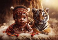 Liefde voor de natuur, tussen een Afrikaanse baby in traditionele klederdracht en een jonge tijger, respect voor al wat leeft en vriendschap voor het leven. Wederzijds vertrouwen is de basis. Het beeld is met behulp van ai gegenereerd.