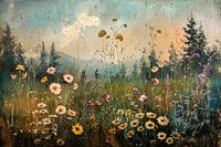 Dit betoverende kunstwerk vangt de essentie van een wilde bloemenweide op een magische wijze, met een achtergrond die een dromerig, bijna mystiek landschap suggereert.