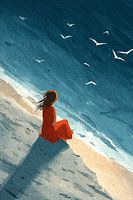 Een sfeervol en minimalistisch werk waarin een vrouw in een felrode jurk op het strand zit, terwijl meeuwen door de azuurblauwe lucht zweven. De wind speelt met haar haren terwijl ze uitkijkt over de oceaan, wat een gevoel van vrijheid en contemplatie oproept. De compositie straalt rust en sereniteit uit door het gebruik van zachte kleuren en vloeiende lijnen.