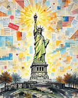 Op deze indrukwekkende foto staat het Vrijheidsbeeld majestueus op de voorgrond, trots uitkijkend over de skyline van New York. Omringd door een fascinerende compositie van grafische details en artistieke elementen, wordt het standbeeld de centrale focus van het kunstwerk. Haar iconische groene gezicht straalt kracht en vrijheid uit terwijl de zon zachtjes achter haar ondergaat en de hemel baadt in een warm, gouden licht.