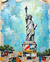 Op deze indrukwekkende foto staat het Vrijheidsbeeld majestueus op de voorgrond, trots uitkijkend over de skyline van New York. Omringd door een fascinerende compositie van grafische details en artistieke elementen, wordt het standbeeld de centrale focus van het kunstwerk. Haar iconische groene gezicht straalt kracht en vrijheid uit…