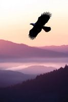 Zwevend over glooiende heuvels en in de zachte kleuren van de schemering wekt deze majestueuze vogel een indruk van vrijheid en ruimte. Zijn krachtige vleugels steken duidelijk af tegen de pastelkleurige lucht en creëren een sfeer van rust en inspiratie. Ideaal voor een woonkamer die uitnodigt om te dromen en te ontspannen.