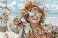 Een kind straalt in de zon, bedekt met zand en kleuren alsof de zomer zelf haar heeft beschilderd. Met glanzende zonnebril, wilde haren en een lach vol vrijheid vangt dit beeld de speelse magie van strand en fantasie.