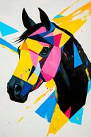 Een krachtige, geometrische uitdrukking brengt het majestueuze hoofd van een paard tot leven, omgeven door levendige kleuren van helder geel, roze en blauw. Deze dynamische compositie brengt energie en creativiteit in elke kamer, ideaal voor een moderne woonkamer of een inspirerend kantoor waar het een gesprek kan stimuleren.