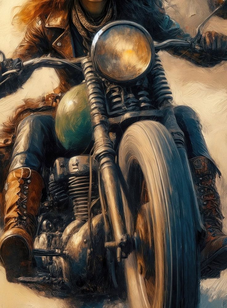 Dit krachtige kunstwerk toont een zelfverzekerde vrouw op een klassieke motor die over een stoffige landweg rijdt. De dynamische compositie en levendige kleuren creëren een gevoel van vrijheid en avontuur. De stijl van het schilderij is een mix van realisme en impressionisme, die de beweging en stemming van het moment perfect vastlegt.