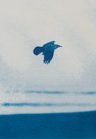 Cyanotype afdruk van een foto die ik maakte aan de Nederlandse kust: een kraai vliegend boven kalme zee.
