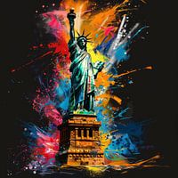 Het Vrijheidsbeeld in New York City springt van de zwarte achtergrond in een explosie van kleurrijke spetters en levendige lijnen. Met 3D-effecten en hyperrealistische illustraties, straalt het beeld vrijheid en democratie uit. Graffiti-geïnspireerde kleurenpaletten mengen zich tot een harmonieus geheel, waardoor dit iconische monument op unieke wijze wordt gevierd. De boodschap van vrijheid en gelijkheid straalt helderder dan ooit tevoren, ons herinnerend aan de voortdurende strijd voor een betere, meer vrije wereld.