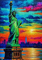 Een prachtige zonsondergang met het Vrijheidsbeeld, gevangen in levendige oliepastels. De vurige sinaasappels en roden van de ondergaande zon creëren een dramatische achtergrond en werpen een warme gloed op het silhouet van het standbeeld. De donker wordende lucht gaat geleidelijk over in zacht paars en blauw, die weerspiegelen in het…