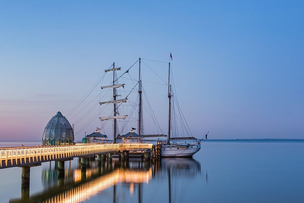 Voor onze hoofden, aan de pier van de Grömitz, ligt het tall ship Loth Lorien, in het prachtige rood van de ochtend. De drie masten van het grote schip zijn te zien op de ongewoon gladde Oostzee.