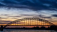De start van de Nijmeegse vierdgaase. Al vroeg in de ochtend lopen de wandelaars bij het ochtendgloren over de Waalbrug van Nijmegen. Zij beginnen aan de dag van Elst en lopen een afstand van 30, 40 of zelfs 50 kilometer. Door heel vroeg op te staan kon ik deze foto maken zodat het silhouet van de brug en de wandelaars mooi afsteekt tegen de mooie kleurrijke zonsopkomst.