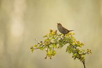 Een winterkoninkje baltst in de vroege ochtend. De laagstaande zon geeft warm tegenlicht, het is nog een beetje mistig