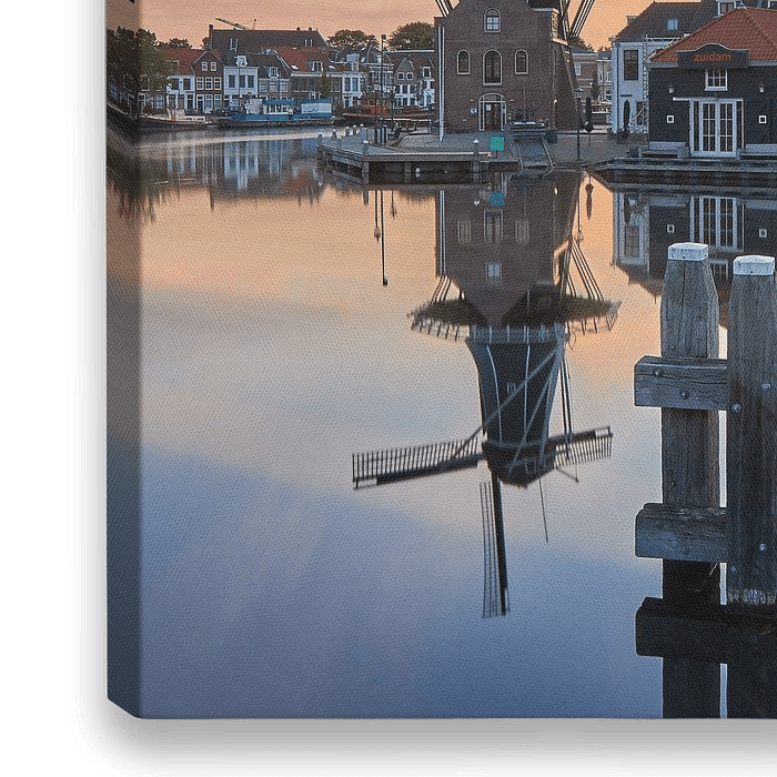 Molen de Adriaan vlak voor de zon op zou komen. Het water van het Spaarne was prachtig stil, waardoor de stad perfect werd gereflecteerd in het water.