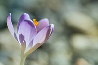 De eerste krokussen dienen zich weer aan. Dit is een close-up van een solitaire paarse krokus in het grindpad.